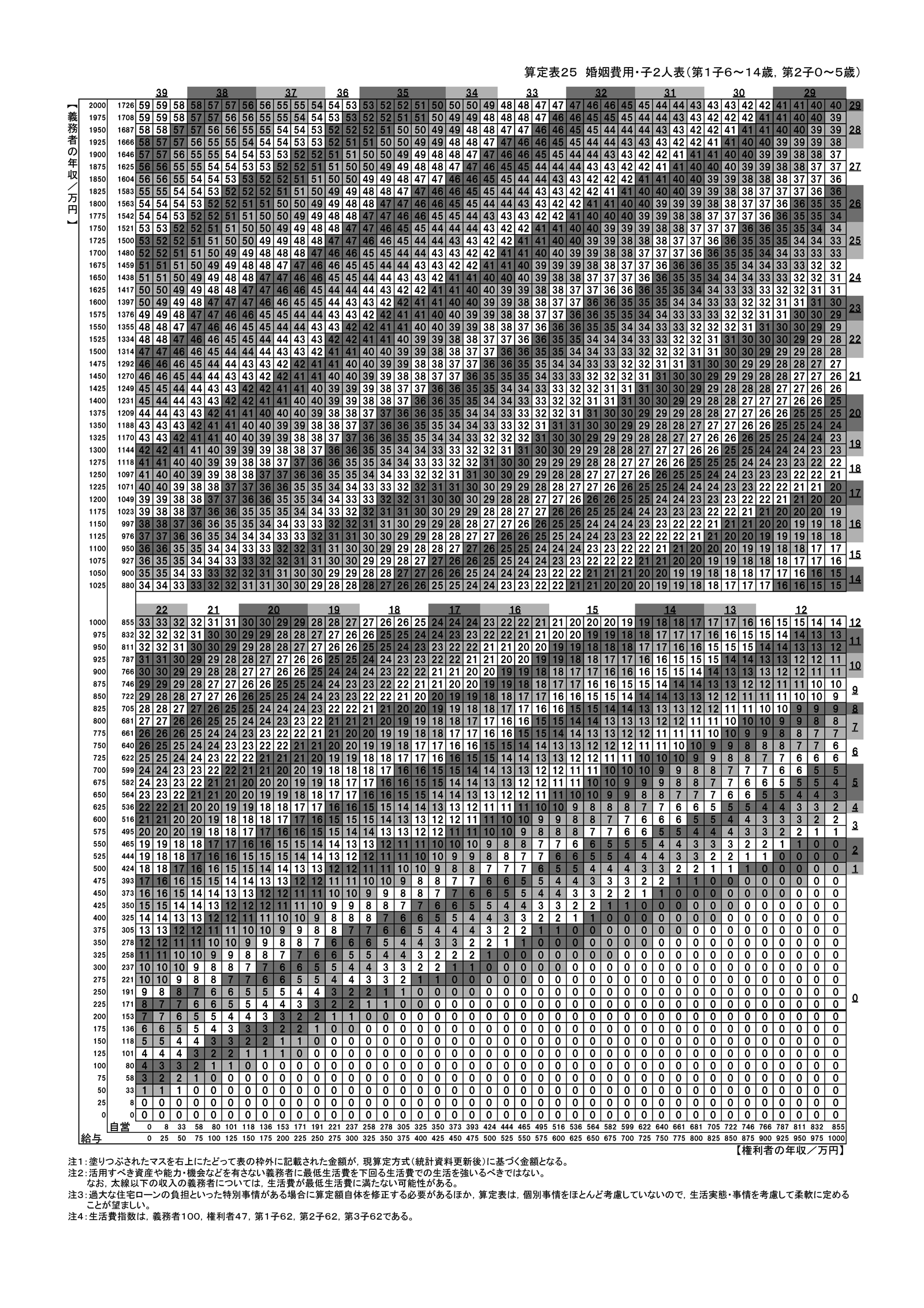 新しい算定表はこちらからご覧いただけますが40ページもあり、子どもの数や状況など、自分に合ったものを見つけるのも難しいですので、以下に探しやすく並べてみました。よければご利用ください。(日本弁護士連合会の資料を引用して作成)